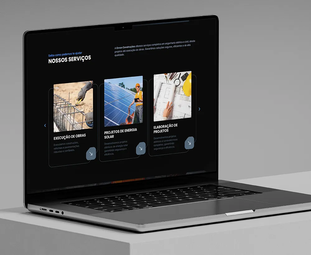 Enron Construções, empresa especializada em engenharia civil, projetos de energia solar e execução de obras industriais e corporativas. O objetivo foi criar um site institucional moderno, robusto e estratégico, capaz de comunicar autoridade técnica e gerar oportunidades comerciais com clareza e impacto visual.